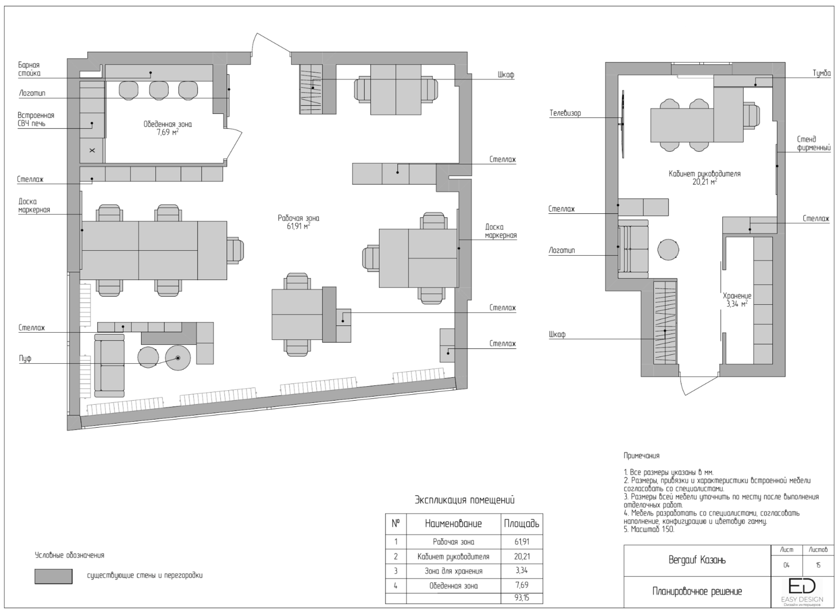 Пространство организовано с учетом разделения на функциональные зоны. Общий зал преобразован в комфортную зону приема пищи, уютную зону отдыха и просторный рабочий кабинет. Каждое рабочее место спроектировано с учетом нормативов и эргономики, обеспечивая идеальные условия для продуктивной работы.