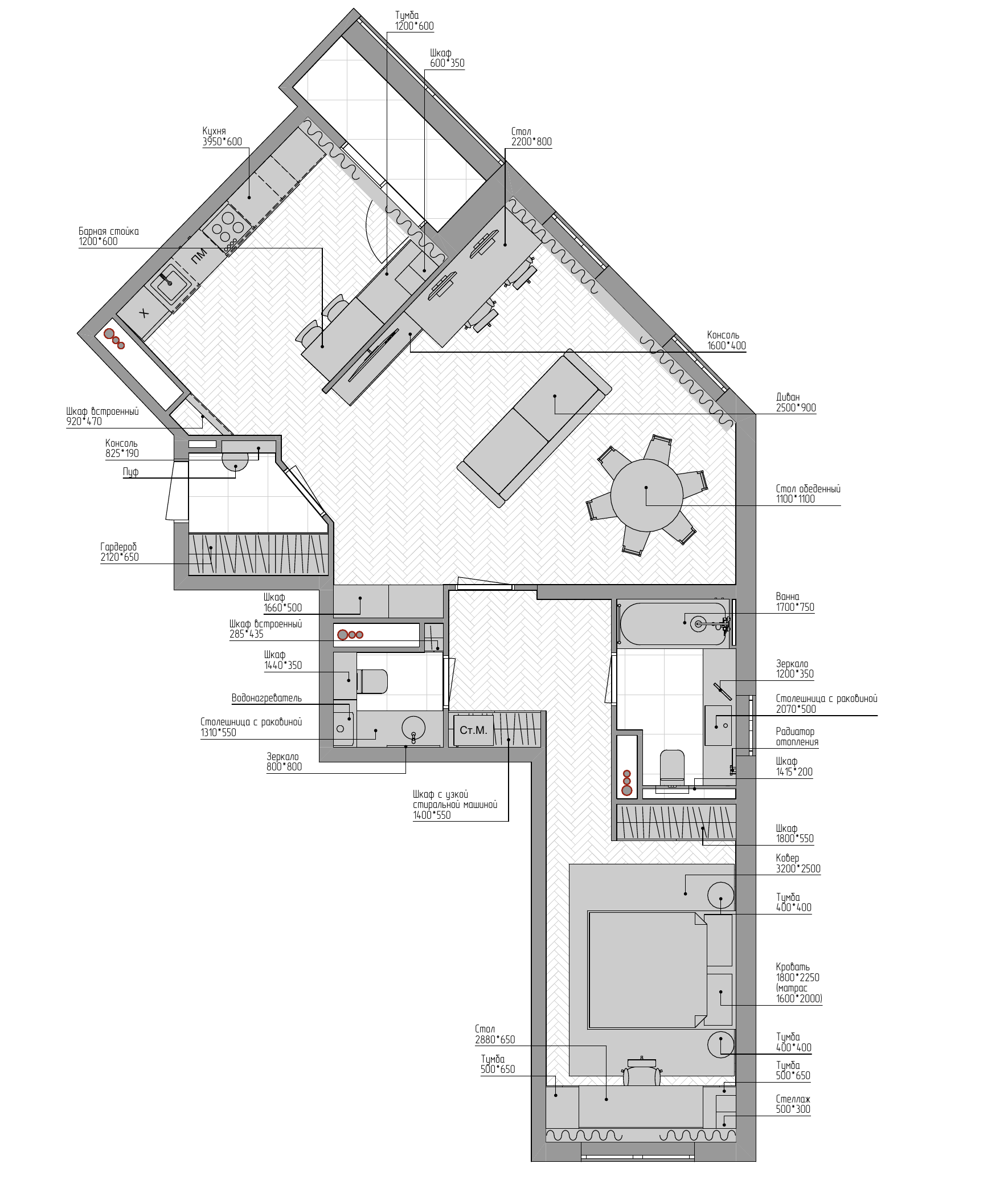 Интерьер выполнен в нейтральных светлых серых тонах, что создаёт ощущение простора и лёгкости. Мебель с текстурой натурального дерева добавляет тепла и природной гармонии в общий облик квартиры.