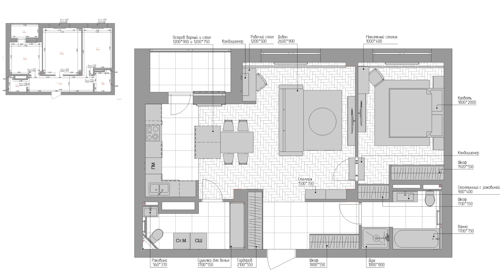 Квартира поделена на два блока: приватный и общий , это явно прочитывается в дизайне и формирует основную архитектурную идею. В квартире предусмотрены кухня-гостиная, спальня, ванная комната, а также гостевой санузел с зоной прачечной.