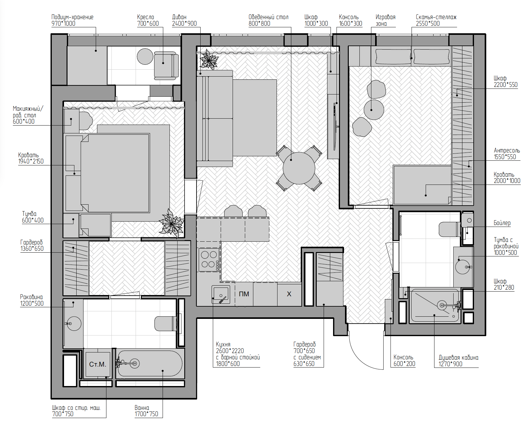 Этот современный и стильный интерьер площадью 67 квадратных метров идеально подходит для комфортного проживания семьи с ребенком.